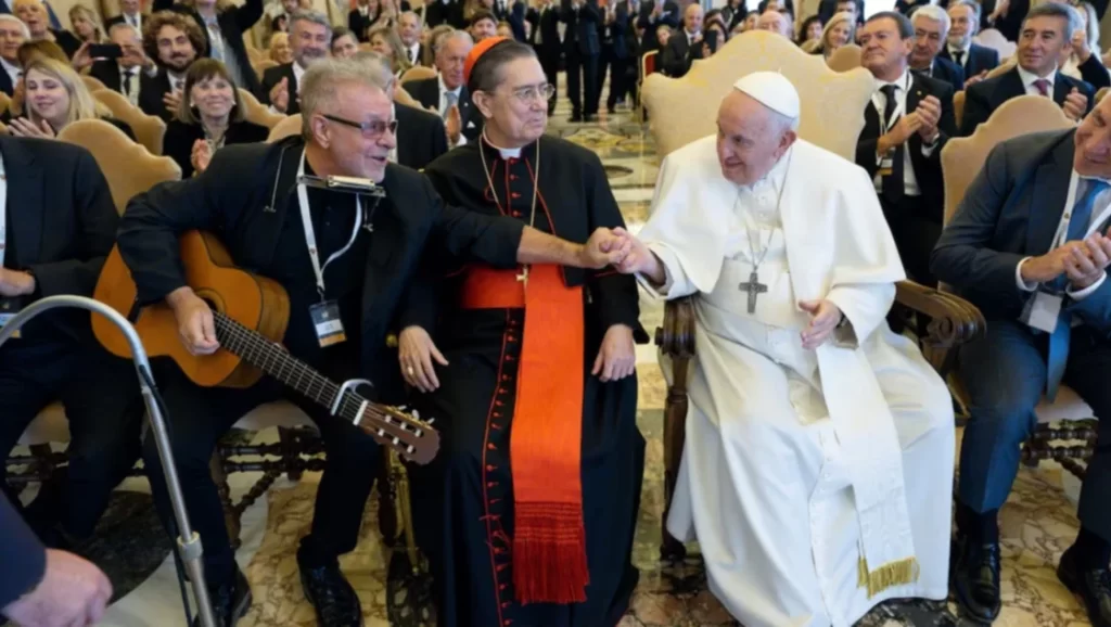 “Hoy viví una experiencia diferente y muy especial”, manifestó León Gieco en su cuenta de Instagram. El cantante fue uno de los invitados de esta mañana en el Vaticano y entonó la canción «Solo le pido a Dios» ante el Papa Francisco.