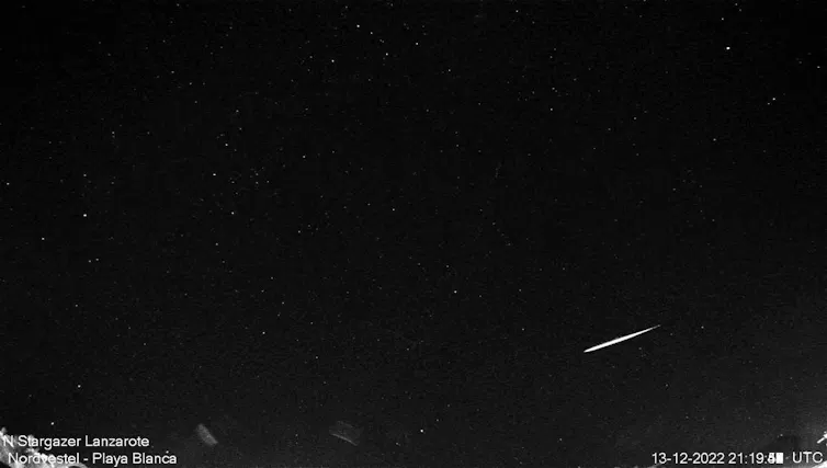 Los meteoritos que proceden de ese tipo de asteroides se conocen como condritas carbonáceas. Pueden contener más de un 1 % de masa de agua, que se encuentra formando minerales hidratados: carbonatos, óxidos y arcillas. Así, estas noches de diciembre contemplaremos una lluvia de meteoros producidas por la ablación en la atmósfera de esas condritas.