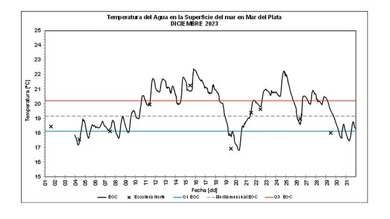 De esta manera, mediante un comunicado, los expertos detallaron la temperatura del agua en la superficie del mar en Mar del Plata durante diciembre de 2023; siendo que «los datos fueron obtenidos a intervalos de 5 minutos con un termómetro SBE38 instalado en la Estación de Observaciones Costeras (EOC) del SHN ubicada en el Muelle del Club de Pescadores (38º 00′ 02″ S y 57º 32′ 18″ O)».