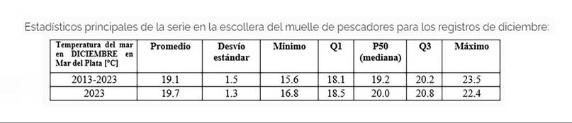 Vale destacar que el Gabinete de Oceanografía Física del Instituto Nacional de Investigación y Desarrollo Pesquero (INIDEP) también se refirió a las temperaturas del «agua en la superficie del mar en Mar del Plata durante noviembre de 2023» y señalaron un promedio de 16,3°C.