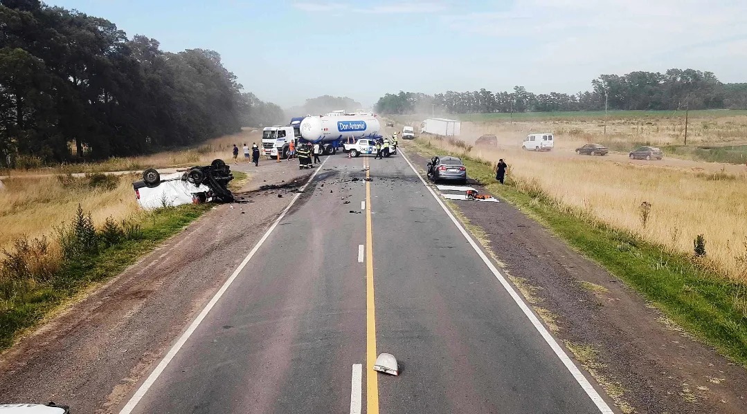 El terrible triple accidente ocurrió este miércoles alrededor de las 7.30 hora en el kilómetro 130 de la Ruta Nacional N°5. Un hombre murió en el acto y un policía de Bragado falleció horas después en el hospital. Una mujer pelea por su vida.