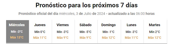 El viernes la mínima será de tres grados bajo cero y la máxima no llegará a los dos dígitos, en tanto será el día más frío con cinco grados bajo cero de mínima y una máxima de 9. Para el domingo subirá un poco pero como se esperan vientos se calcula que pese al sol la sensación térmica también será bajo cero.