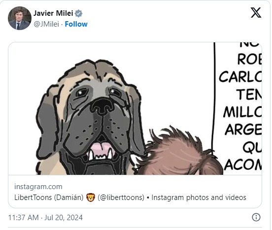 El presidente Javier Milei se unió al festejo y compartió un posteo de una caricatura que lo muestra a él junto a un perro y una frase.