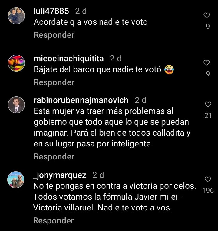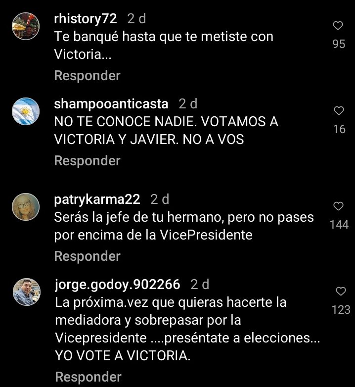 «Te banqué hasta que te metiste con Victoria», «serás el jefe de tu hermano, pero no pases por encima de la vicepresidente», «la próxima vez que quieras hacerte la mediadora y sobrepasar por la Vicepresidente ….preséntate a elecciones…YO VOTE A VICTORIA» y «Dejá q los demás hacer su trabajo, Victoria Villarruel Vicepresidente y Diana Mondino la Canciller. Hacete a un lado Karina que no te votamos a vos», fueron algunos de los cientos de comentarios que le dejaron a Karina Milei.