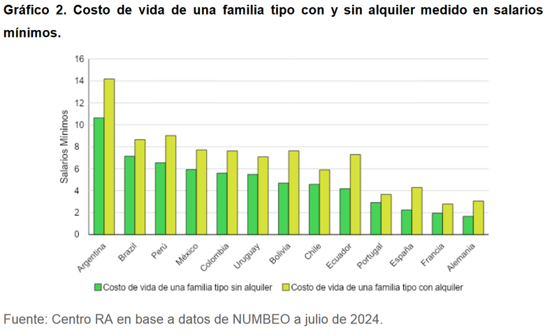 El informe destaca que la diferencia con otros países «puede observarse principalmente con Brasil, segundo país más caro de la región, ya que en Argentina se necesita un salario más para adquirir una canasta de consumo básica y dos salarios mínimos más si se considera el alquiler«.
