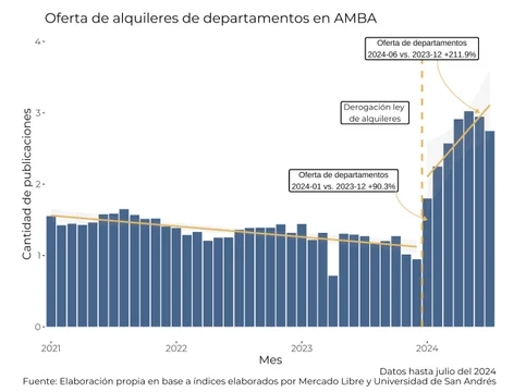 El informe elaborado en base a datos aportados por Mercado Libre y la Universidad de San Andrés, reveló que en enero de 2024 la oferta de departamentos en alquiler en el AMBA fue 90,3% mayor que en diciembre de 2023, mientras que en junio la oferta de propiedades fue un 211,9% mayor que la registrada antes de la derogación de la ley.