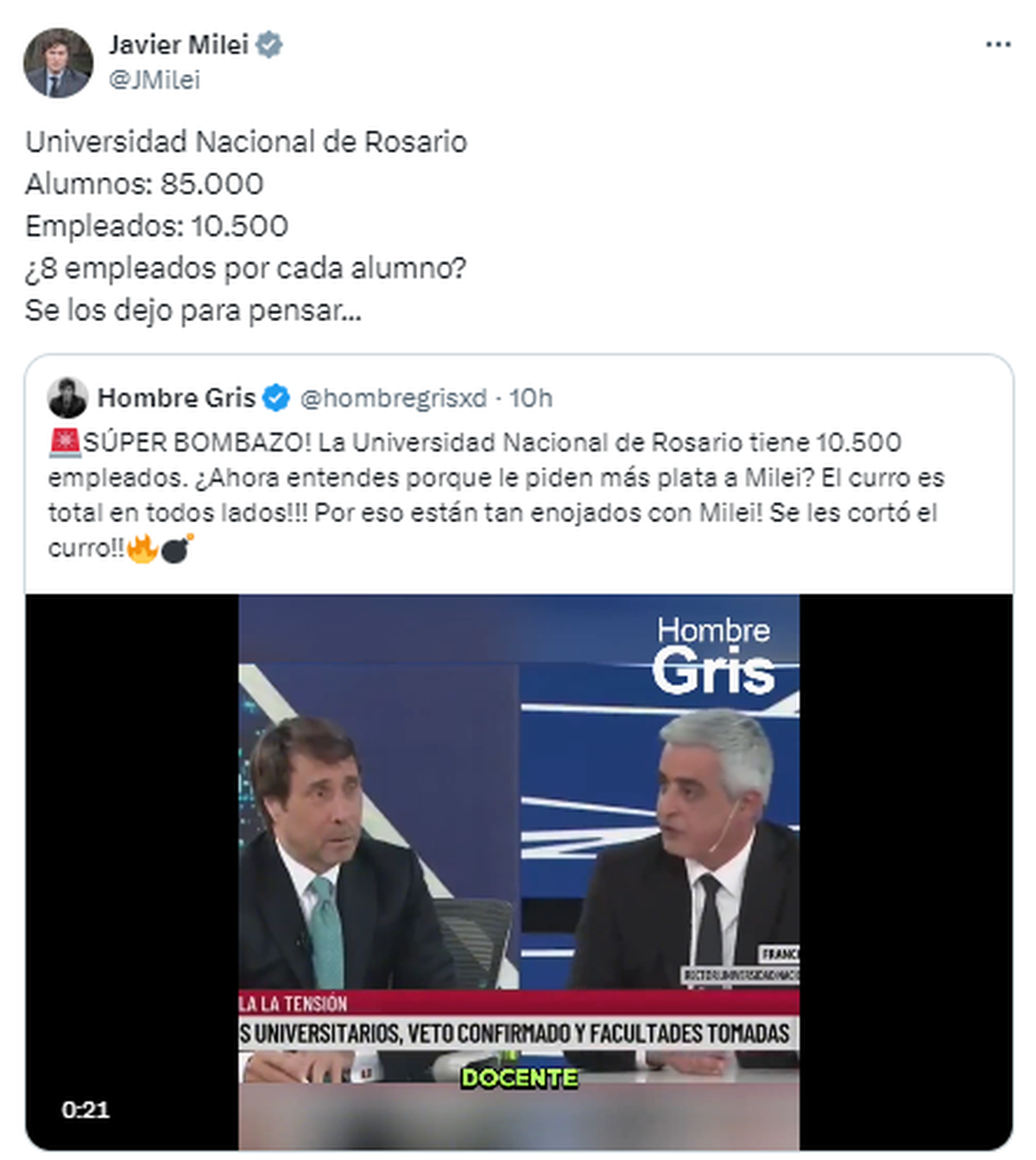 Tras la ratificación en la Cámara de Diputados del veto presidencial a la Ley de Financiamiento Universitario, el presidente Javier Milei cuestionó la cantidad de empleados de la Universidad Nacional de Rosario (UNR) en Twitter, pero realizó un planteo incorrecto. Más tarde, corrigió con otro mensaje en el que pidió «perdón».