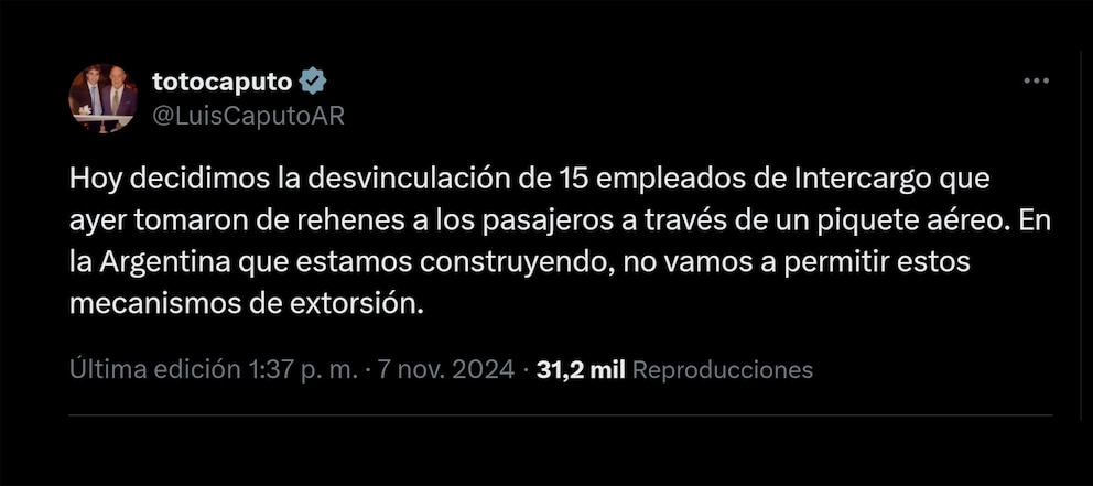 «Hoy decidimos la desvinculación de 15 empleados de Intercargo que ayer tomaron de rehenes a los pasajeros a través de un piquete aéreo. En la Argentina que estamos construyendo, no vamos a permitir estos mecanismos de extorsión», escribió Caputo.