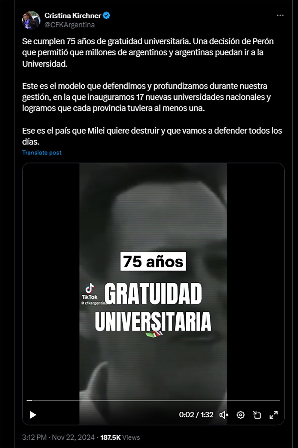 La jefa del PJ nacional llegó el viernes por la noche a Rosario. Desde allí posteó en su cuenta de la red social X un homenaje a la gratuidad de la educación. “Se cumplen 75 años de gratuidad universitaria. Una decisión de Perón que permitió que millones de argentinos y argentinas puedan ir a la Universidad. Este es el modelo que defendimos y profundizamos durante nuestra gestión, en la que inauguramos 17 nuevas universidades nacionales y logramos que cada provincia tuviera al menos una. Ese es el país que Milei quiere destruir y que vamos a defender todos los días”, escribió CFK. En ese tono se espera que hable este mediodía, pero enfocado en la salud pública.