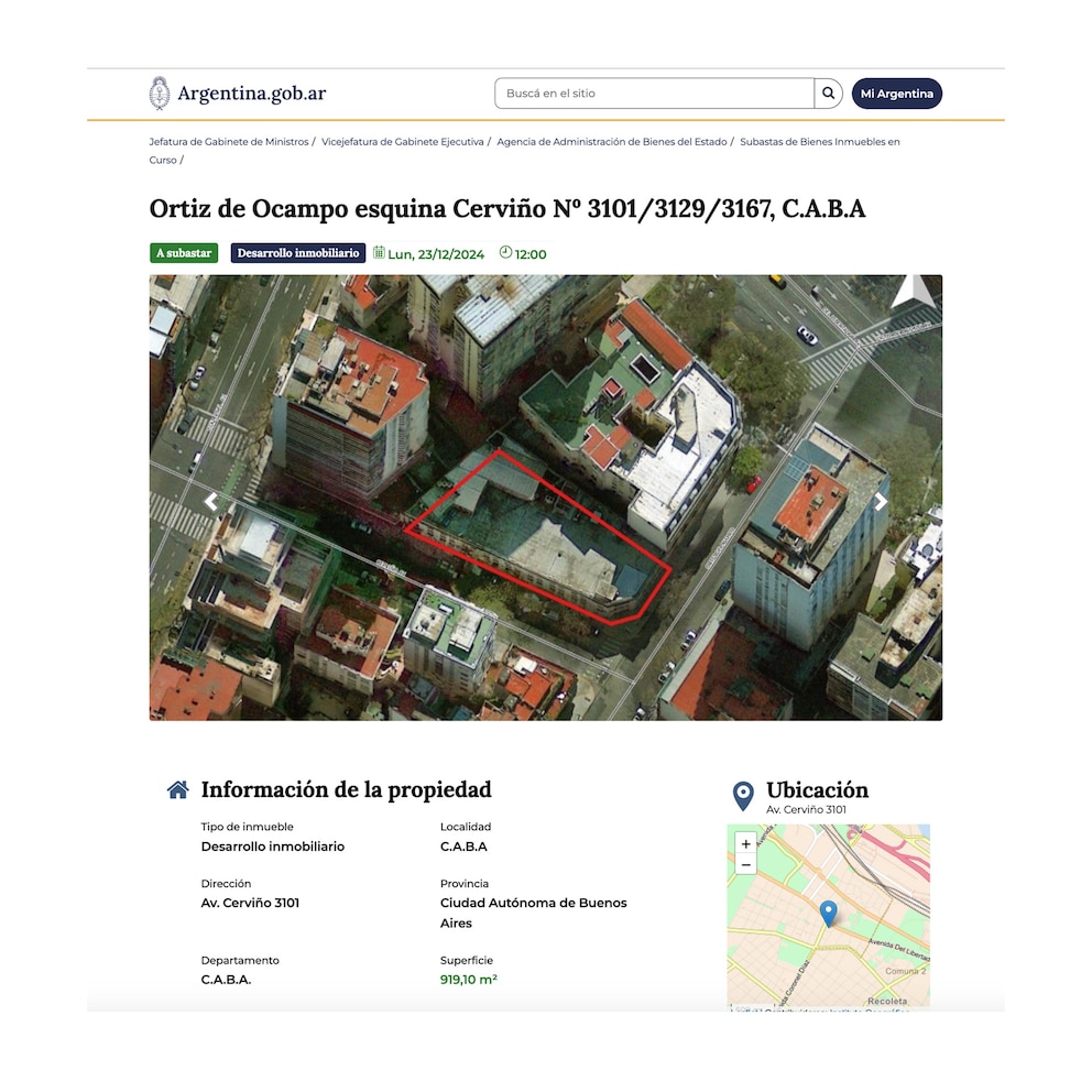 Entre las medidas que anunció el vocero presidencial figura la venta del edificio de la calle Cerviño y Ortiz de Ocampo, ubicado en una de las zonas más cotizadas de Palermo, que ya fue puesta a la venta y cuya subasta se concretará el 23 de diciembre. Allí trabajan actualmente 140 personas, y Adorni señaló que está siendo “sub-utilizado”. Con una superficie total cubierta de 3.143 m2 distribuidos en tres plantas sobre un terreno de 919 m2, el precio base de venta es de USD 6.378.968, según la valuación hecha por el Tribunal de Tasaciones de la Nación en 1° de noviembre pasado. El destino previsto para el edificio ya puesto en venta – según figura en la web de la AABE – es el de “desarrollo inmobiliario”. La decisión ya había sido publicada el viernes en el Boletín Oficial.