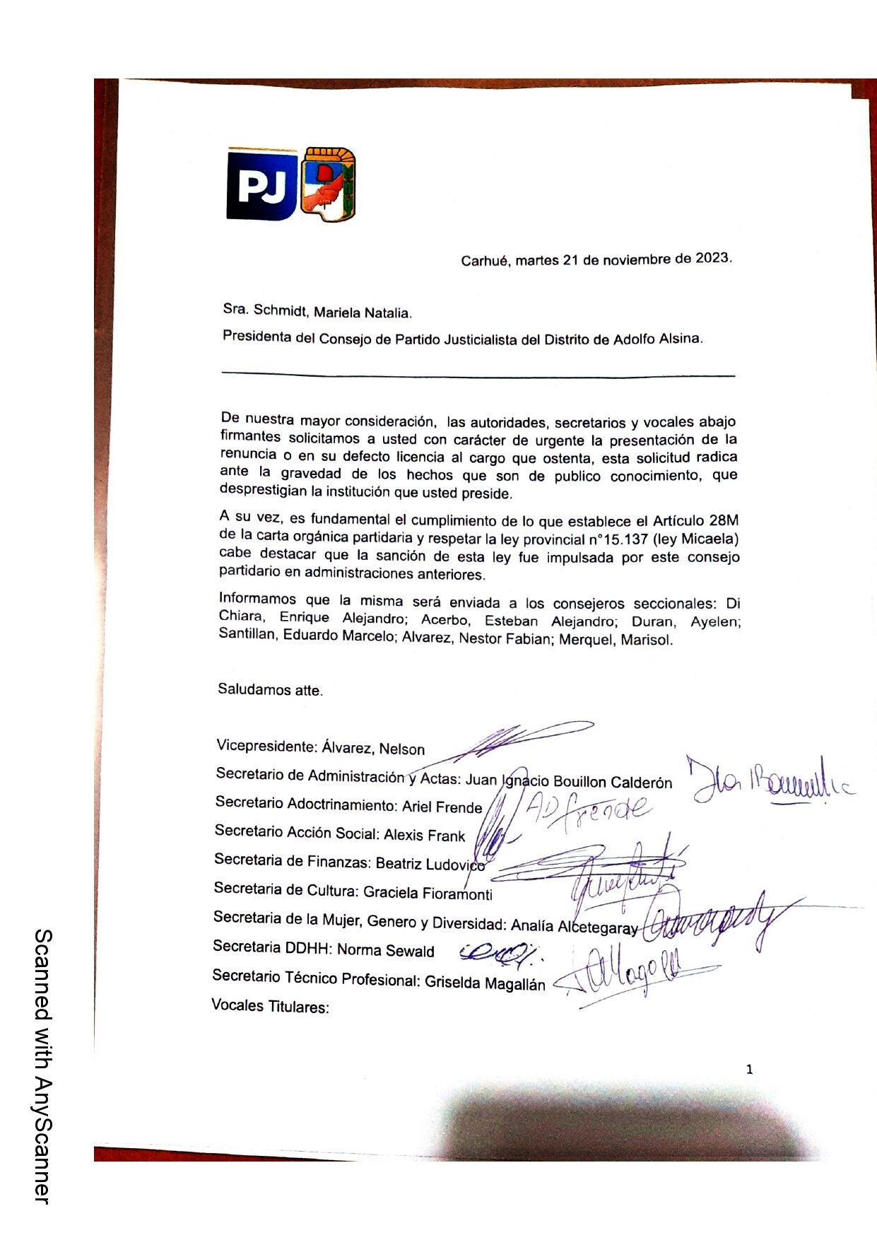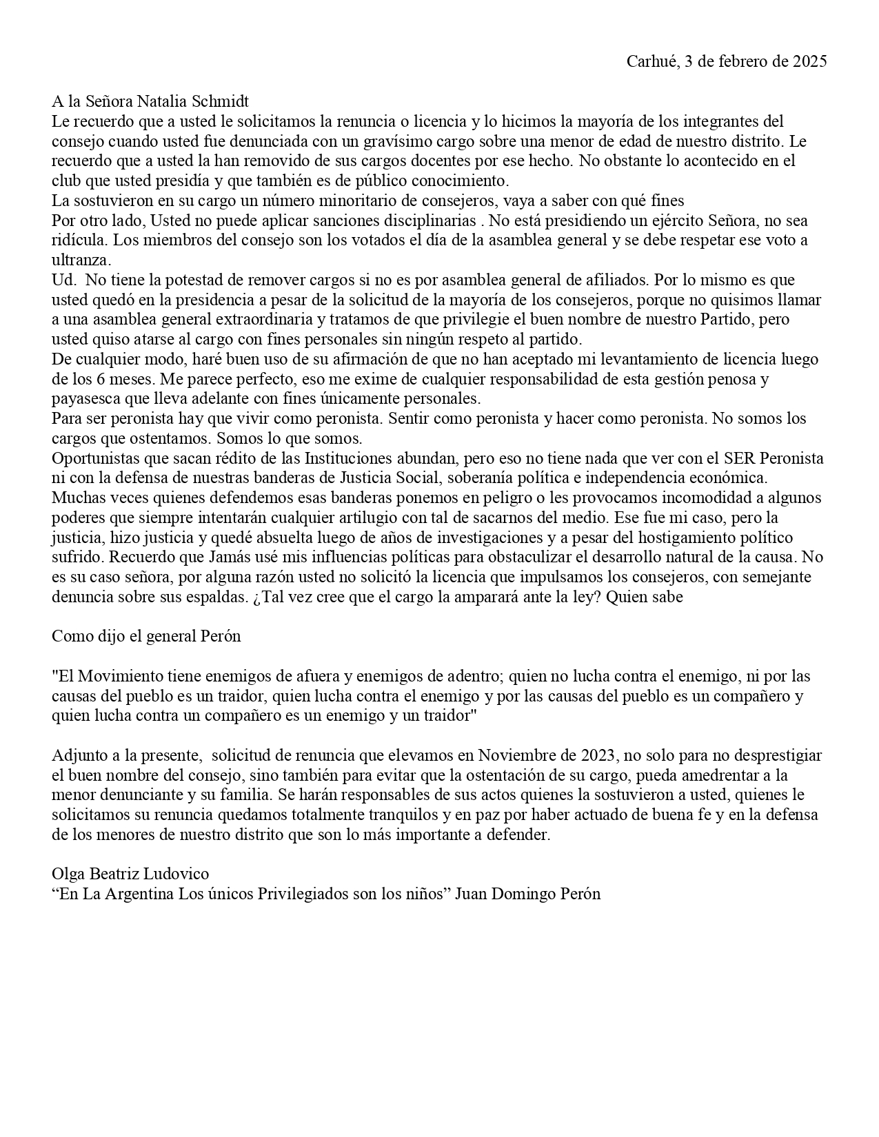 Luego del comunicado emitido por el Partido Justicialista de Adolfo Alsina, en el que se informó la aceptación de su renuncia y se desmintieron sus declaraciones, Beatriz Ludovico respondió con duras críticas hacia la presidenta del espacio, Natalia Schmidt.
