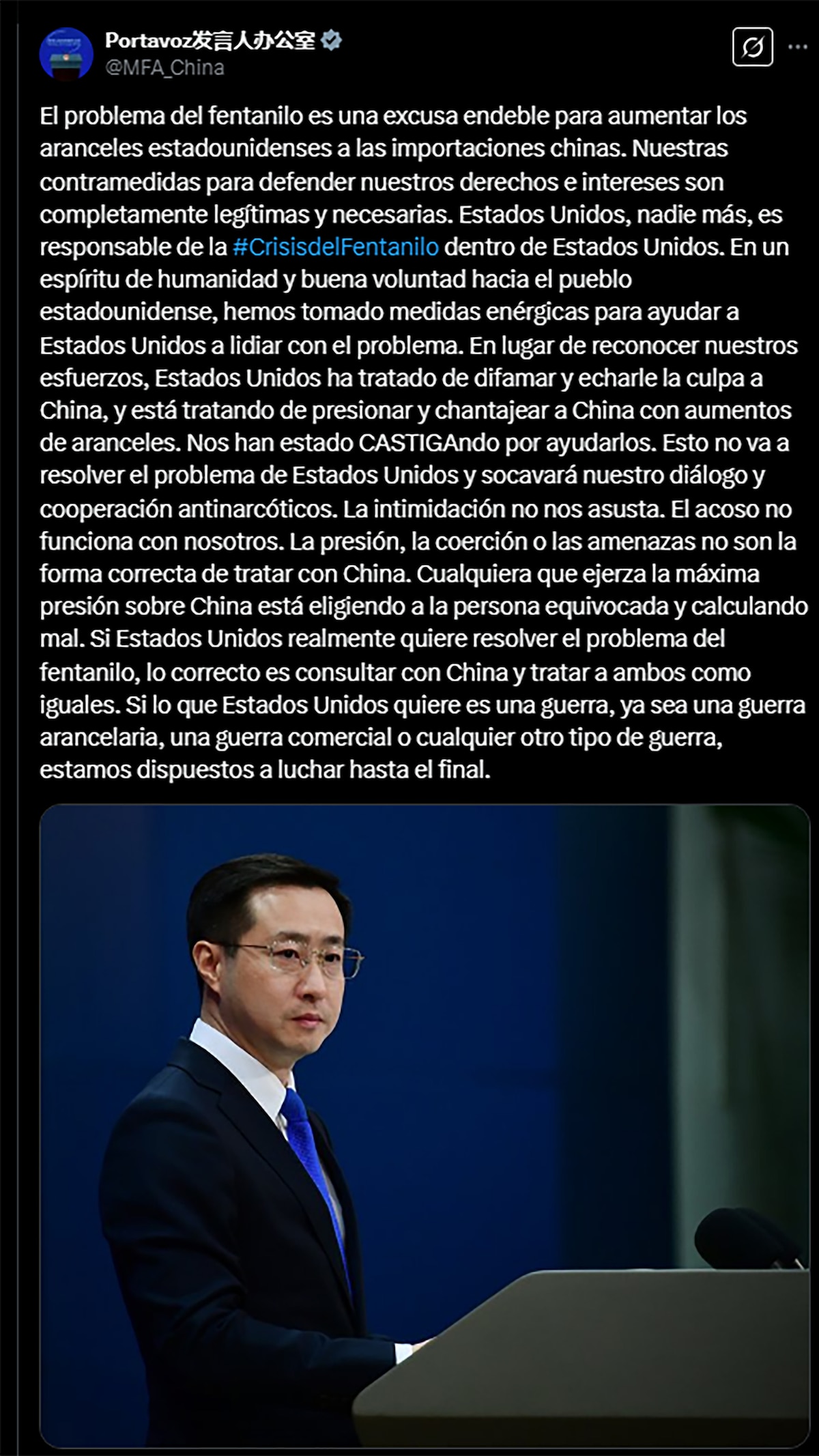 La frase cierra un largo texto publicado tras la confirmación de los aranceles de EEUU a los productos chinos, un intento del gobierno de Donald Trump de obtener mayor compromiso de Beijing para luchar contra el tráfico de fentanilo.