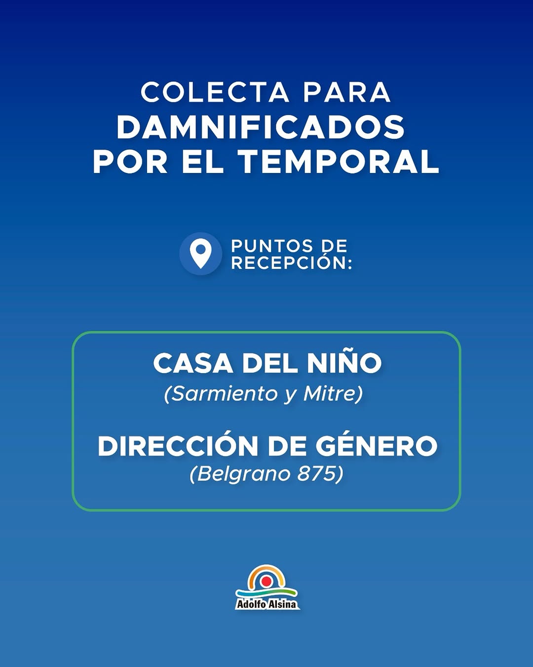 Para facilitar la recepción de donaciones, se han habilitado dos puntos en la ciudad: la Casa del Niño, ubicada en Sarmiento y Mitre, y la Dirección de Género, en Belgrano 875. En estos espacios, los vecinos pueden acercar artículos de limpieza e higiene, colchones, frazadas, ropa y alimentos no perecederos.