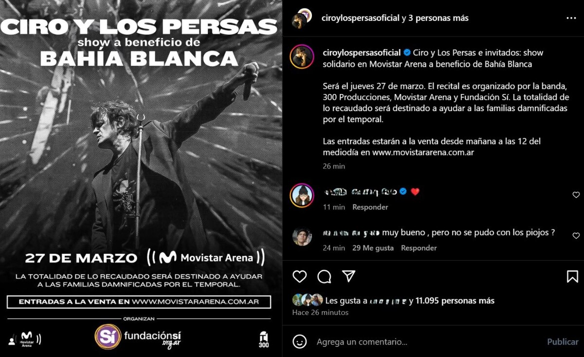 El anuncio se hizo público a través de un afiche que no deja lugar a dudas. En la parte superior, se leen las palabras “Ciro y los Persas show a beneficio de Bahía Blanca”, en mayúsculas blancas, casi como un grito que atraviesa la imagen. Más abajo, el 27 de marzo aparece como una cita ineludible. Será esa noche, en el escenario del Movistar Arena, cuando la música busque convertirse en alivio y refugio.