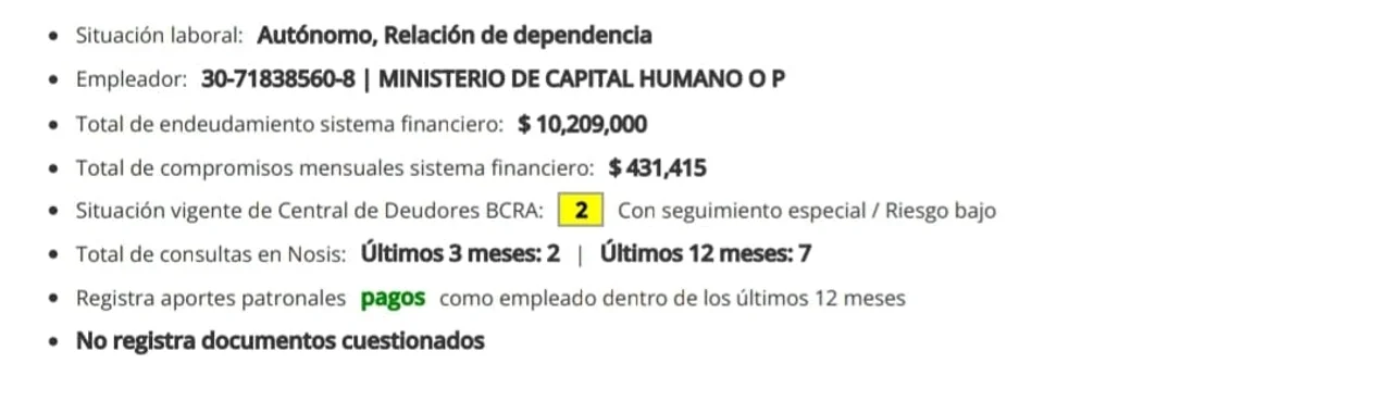 Aunque no registra cheques rechazados ni documentos cuestionados, su perfil financiero muestra un endeudamiento creciente en los últimos meses. Solo en marzo de 2025, su deuda total superaba los $10 millones, con picos de consumo a través de tarjetas de crédito como American Express y ICBC, donde acumuló más de $3.000.000. En Banco Nación, comenzó en junio de 2024 con un gasto de $1.000.000 y en diciembre de dicho año acumuló gastos por $5.000.000, mientras que en el Banco Ciudad mantiene un gasto de $2.000.000 al mes de enero.