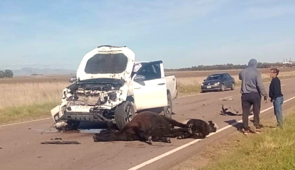Este sábado por la mañana, una camioneta embistió a una vaca y un ternero que se encontraban sobre la Ruta 67, a unos cinco kilómetros de la rotonda con la Ruta 85, en cercanías de la planta de alimentos balanceados Tinago.