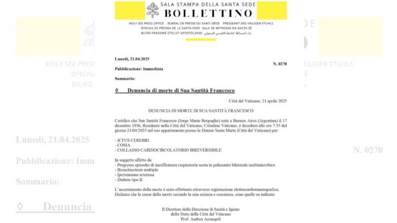 “Certifico que Su Santidad Francisco (Jorge Mario Bergoglio) nacido en Buenos Aires (Argentina) el 17 de diciembre de 1936, residente en la Ciudad del Vaticano, Ciudadano del Vaticano, falleció a las 7.35 horas del día 21/04/2025 en su piso de la Domus Santa Marta (Ciudad del Vaticano) de: un derrame cerebral, coma y colapso cardiovascular irreversible”, dice el comunicado oficial.