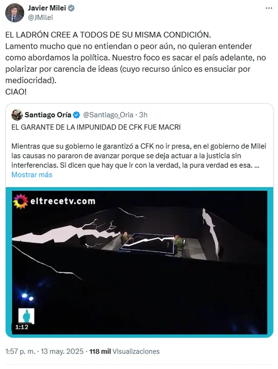 “El ladrón cree a todos de su misma condición”, sentenció el mandatario desde su cuenta de X, en un mensaje que incluye un fragmento de la entrevista que el periodista Jorge Lanata le realizó a Elisa Carrió en la que responsabilizó al gobierno de Cambiemos de haberle garantizado impunidad a Cristina Kirchner.