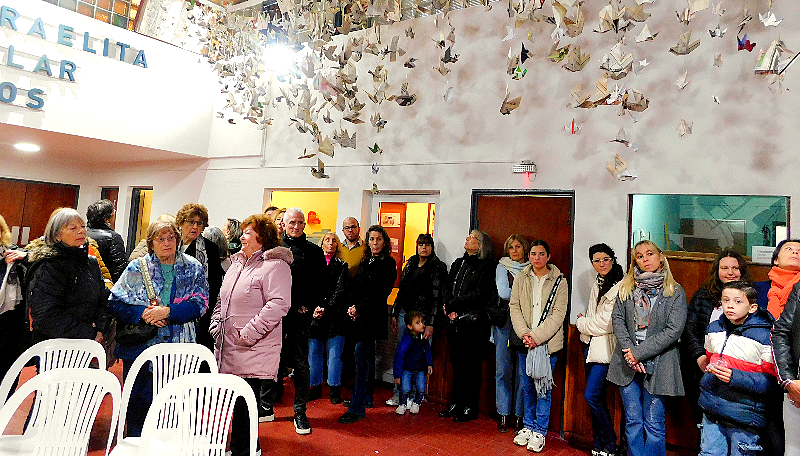 “La muestra parte desde la biblioteca, hermosa y enorme, con una metáfora visual: un libro del que emergen palomas de papel hechas por muchas manos colaboradoras, a partir de hojas de libros repetidos o deteriorados. Esa imagen representa el lema del centenario, ‘La cultura forja alas’. Las palomas atraviesan los vidrios del edificio en busca de nuevos lectores en el pueblo. Es un símbolo poderoso del rol transformador de la cultura”.
