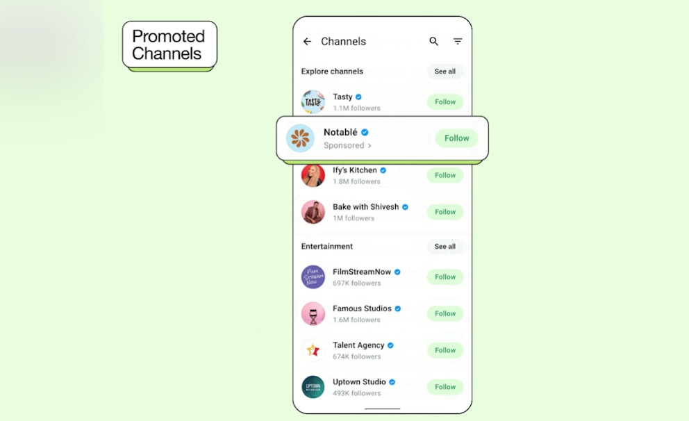 Ahora, al ingresar a la sección de exploración de canales, los usuarios verán sugerencias de canales promocionados que han pautado con Meta para aparecer en esa lista.