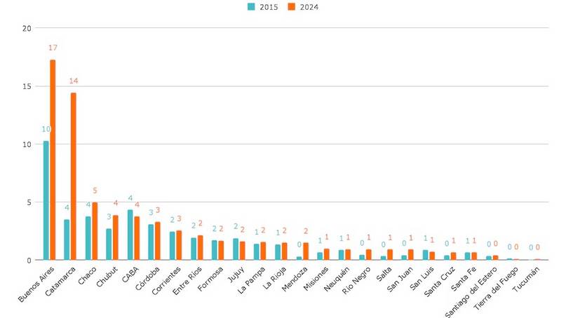 Las provincias donde más creció la cantidad de egresados de los institutos de formación docente en los últimos 10 años son Buenos Aires (+347%), Catamarca (+310%) y Chaco (+175%), señala el informe.