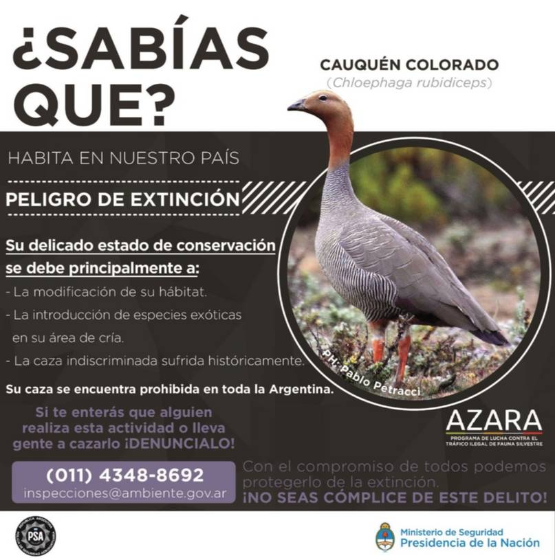 –Debe realizar la correspondiente denuncia ante la autoridad de aplicación en materia de fauna silvestre: la Fiscalía Federal Ambiental, la Dirección de Prevención Ecológica de la Policía de la provincia de Buenos Aires.