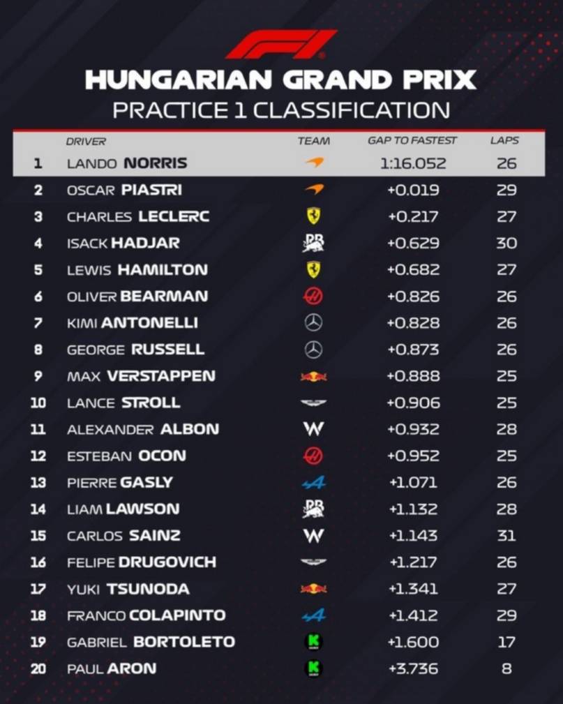 Concluyó la primera sesión de pruebas clasificatorias en Hungría, de cara al Gran Premio de Fórmula 1 que, con la participación de Franco Colapinto (Alpine), se correrá el domingo a las 10, hora de nuestro país.