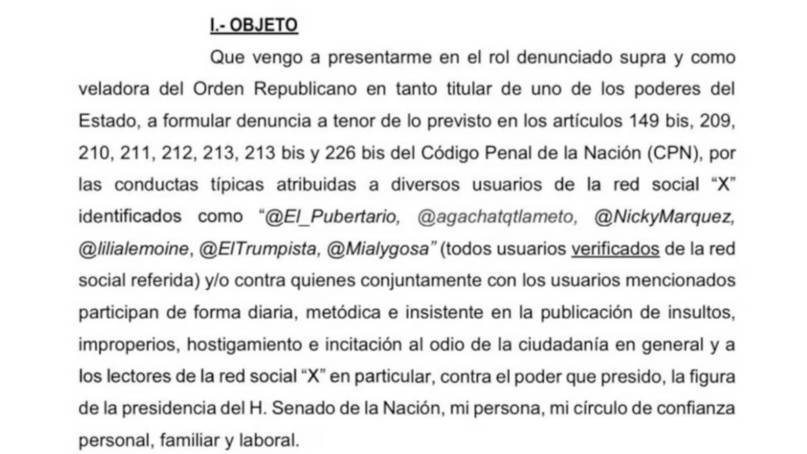 En la segunda presentación, que también recayó en Casanello, la Vicepresidenta apuntó contra tuiteros oficialistas y la diputada Lilia Lemoine por participar “de forma diaria, metódica e insistente en la publicación de insultos, improperios, hostigamiento e incitación al odio de la ciudadanía en general y a los lectores de la red social X en particular, contra el poder que presido, la figura de la presidencia del Honorable Senado de la Nación, mi persona, mi círculo de confianza personal, familiar y laboral”.