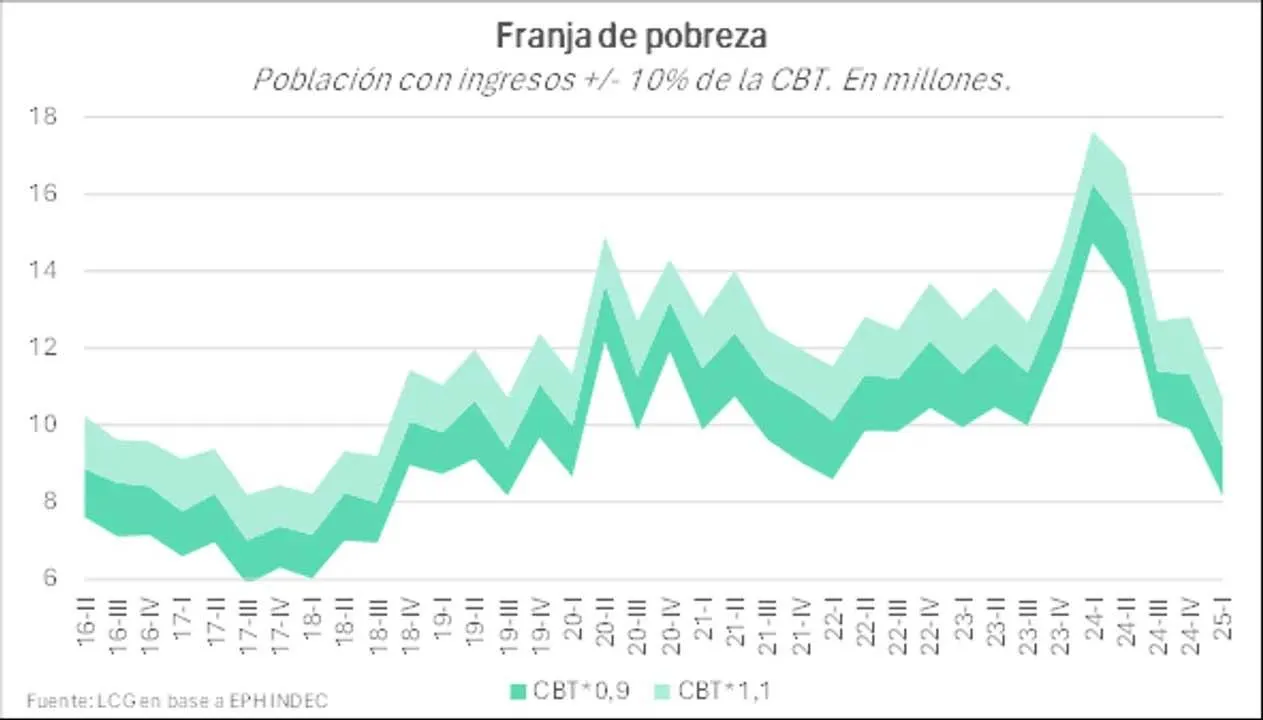 «En principio, esto indicaría que el riesgo de pobreza es menor: hay menos personas con posibilidad de caer en la condición de pobreza, pero también menos personas con chances de abandonarla. En esta franja se ubican 4 millones de personas, 700.000 menos que hace un año».