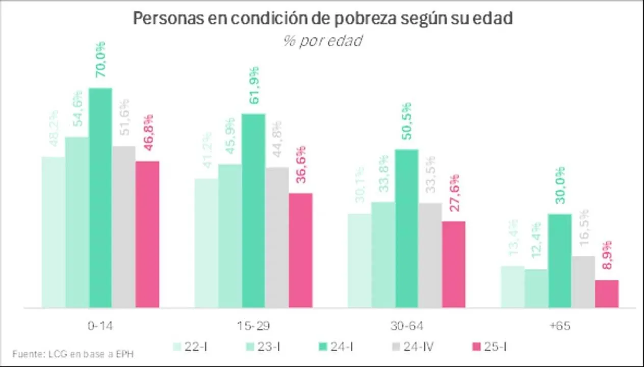 En cuanto al detalle de la pobreza por rango etario, LCG afirmó que «se redujo en todos los rangos trimestre a trimestre, después del pico de comienzos de 2024.»