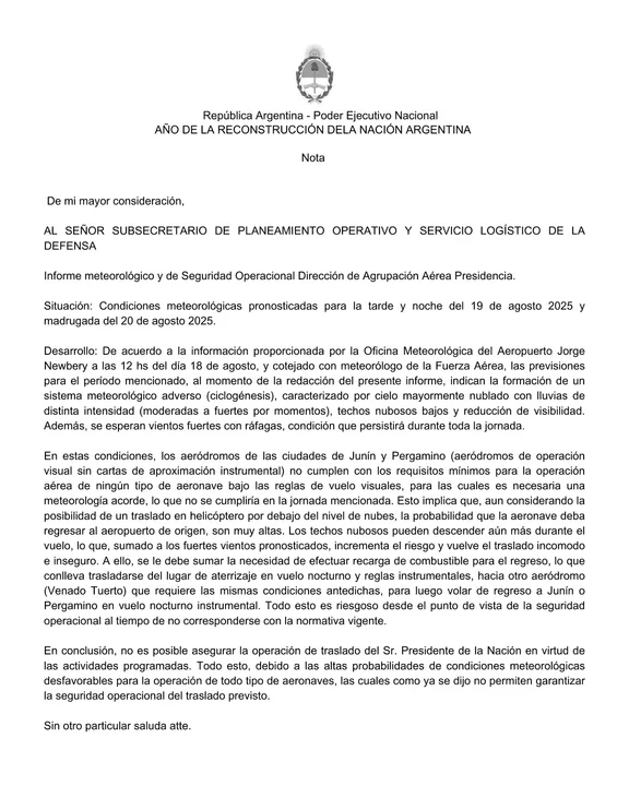 El reporte interno, dirigido al Subsecretario de Planeamiento Operativo de la Defensa, detalló los motivos por los cuales no era posible garantizar la seguridad del traslado del Presidente.