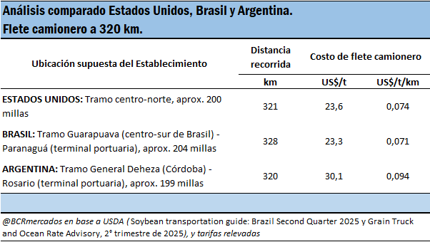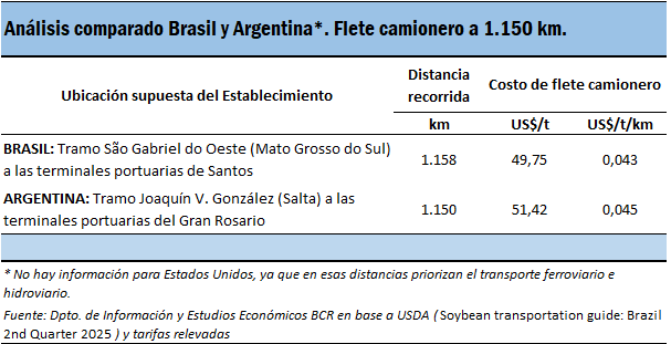 En este marco, lo que hizo la entidad rosarina fue comparar el costo del flete para una distancia de 320 kilómetros, el equivalente a 200 millas, en los tres países, y comparar también para una distancia de 1.150 kilómetros entre Argentina y Brasil (no se incluyó a Estados Unidos porque en distancias largas el país norteamericano opta por otro tipo de transporte, como el tren o la barcaza).
