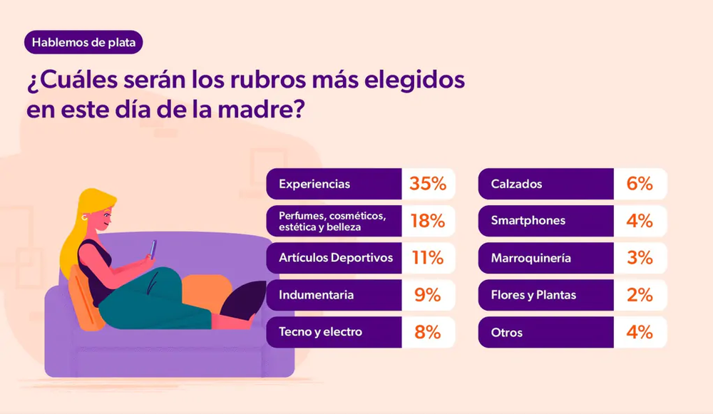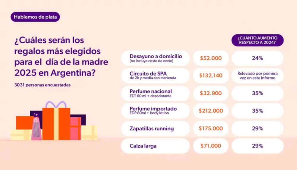 Sobre la base de los rubros más elegidos al momento de pensar en los regalos, la consultora relevó una serie de productos: desayuno a domicilio, $ 52.000, y circuito de spa (duración dos horas con merienda), $ 132.140; perfumería: pack perfumes nacional, $ 32.900, importado, $ 212.000; y artículos deportivos, zapatillas running, $ 175.000, y calza larga, $ 71.000. Con referencia al aumento interanual de estos rubros, los mismos se encuentran entre el 24% y 35% de aumento con respecto de 2024.
