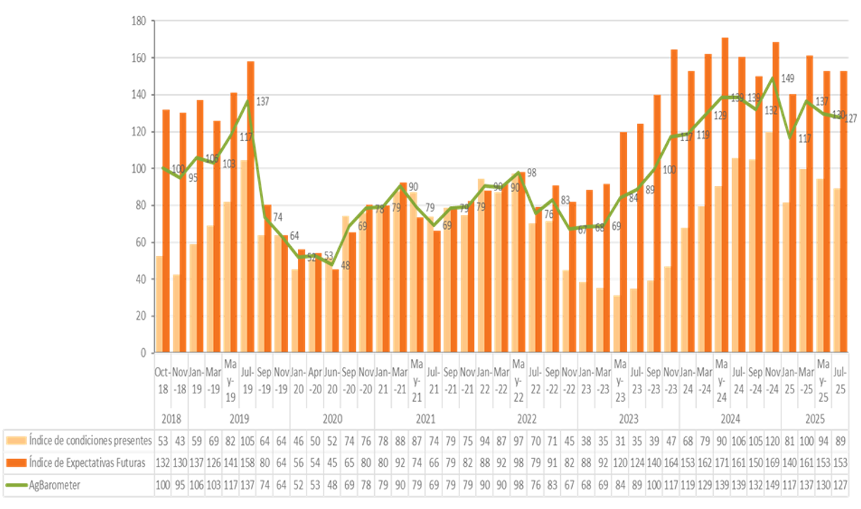 A pesar de una leve caída, la confianza de los productores agropecuarios se mantiene en terreno positivo, según la última edición del Ag Barometer Austral, elaborado por el Centro de Agronegocios y Alimentos de la Universidad Austral. La encuesta, que sondeó el ánimo de los productores durante los meses de septiembre y octubre, revela que el optimismo del sector se fundamenta más en las expectativas hacia el futuro que en la situación presente, aunque muestra un deterioro sostenido a lo largo de 2025 respecto del año anterior.