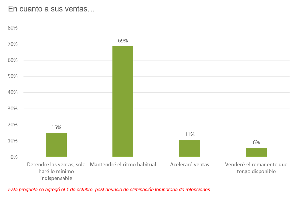 Finalmente, la encuesta señala que la baja temporal de retenciones a cero, aplicada el 22 de septiembre y vigente por tres días, no modificó significativamente las estrategias de venta de los productores.