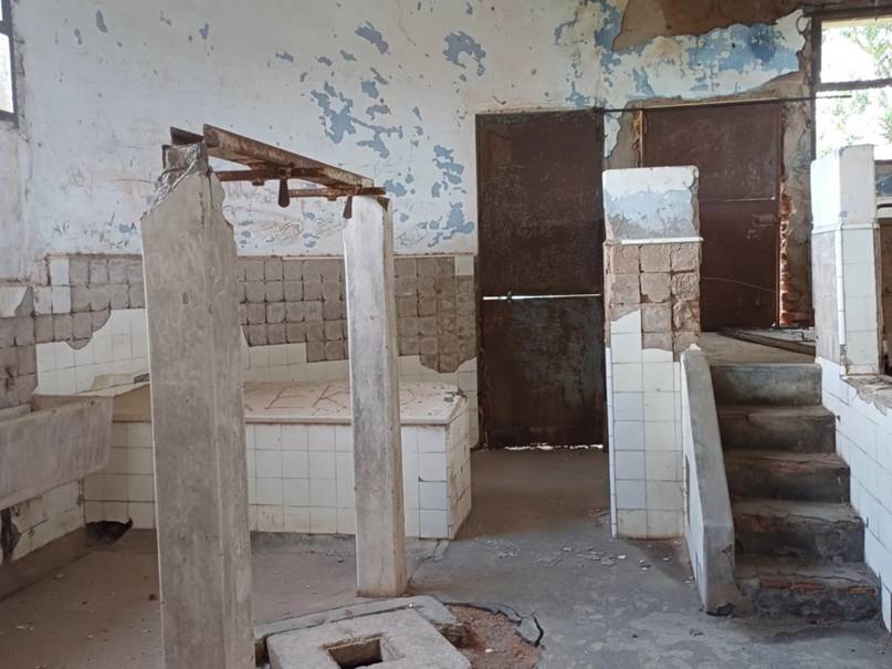 También hay hierros oxidados expuestos, correspondientes a columnas y vigas, instalaciones en pésimo estado y aberturas y escaleras deterioradas, aunque se conserva gran parte del equipamiento original de rieles de transporte de reses, mesadas, piletas, guías y otros elementos.