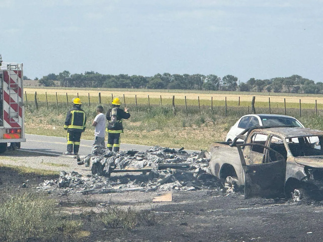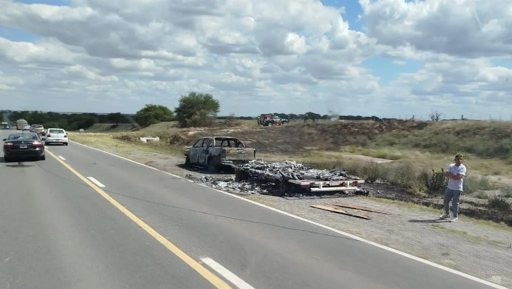 Un impactante incendio se registró este sábado alrededor de las 15:00 horas en la Ruta Nacional 35, en el tramo comprendido entre Winifreda y Santa Rosa, donde una camioneta y el carro que remolcaba quedaron completamente destruidos por las llamas.
