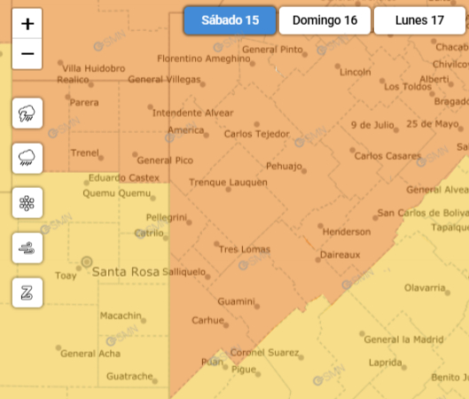La alerta naranja comprende a los distritos de Adolfo Alsina, Daireaux, Guaminí, Pellegrini, Salliqueló, Trenque Lauquen y Tres Lomas.