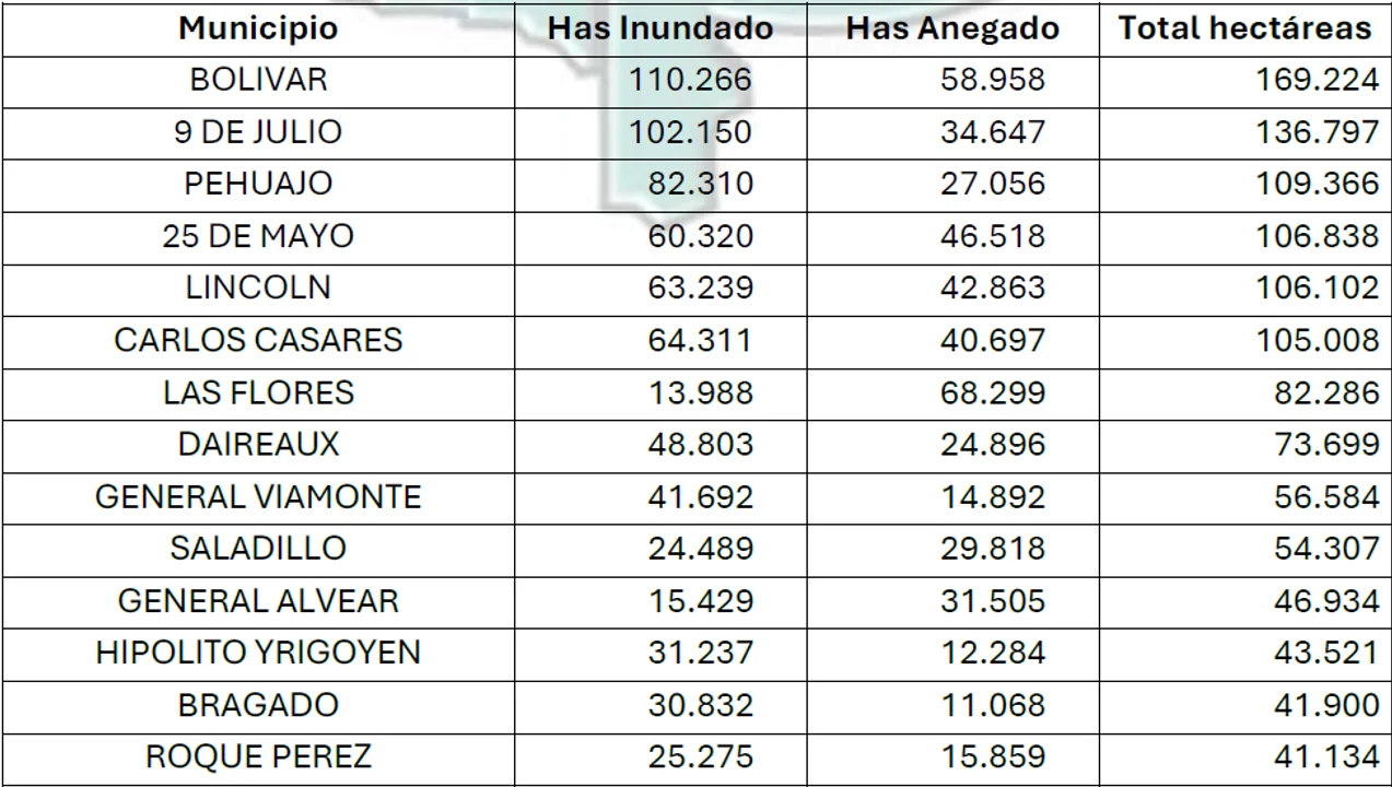 Entre los partidos más afectados se ubica Bolívar con 169.224 hectáreas inundadas o anegadas, seguido por el municipio de 9 de Julio, con 136.797 hectáreas en total, y Pehuajó con 109.366.