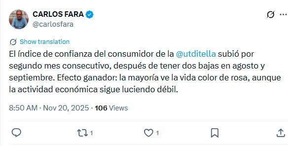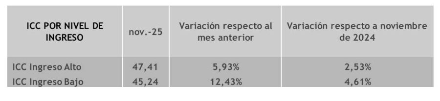 De acuerdo con el relevamiento por realizado el Centro de Investigación en Finanzas de la Universidad di Tella entre el 1 y el 13 de noviembre de 2025, el Índice de Confianza del Consumidor (ICC) aumentó 8,79% respecto de octubre, y algo más de 2% interanual.