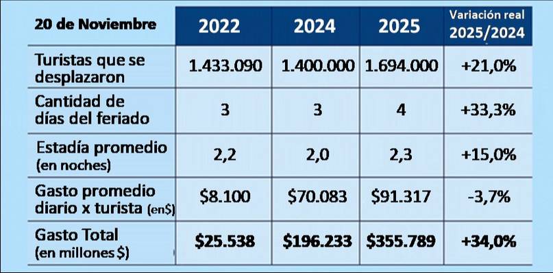 En total, los turistas desembolsaron $ 355.789 millones el fin de semana, lo que implica un aumento del 34% real frente a los $ 196.233 millones gastados en 2024.