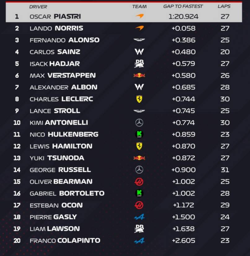 El mejor fue Lando Norris (McLaren) con un tiempo de vuelta de 1m20/924 y un total de 27 giros al trazado que tiene 5,418 kilómetros. Lo siguieron Lando Norris (McLaren) a +0.058 en segundo lugar y Fernando Alonso (Aston Martin) como tercero a +0.386.