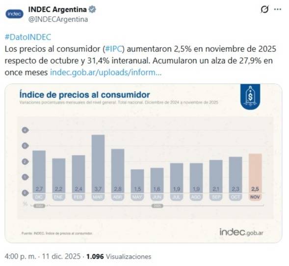 El Índice de Precios al Consumidor (IPC) registró un aumento del 2,5% en noviembre de 2025 respecto al mes anterior, una nueva aceleración del índice que se ubica por encima del 2,3% registrado en octubre.