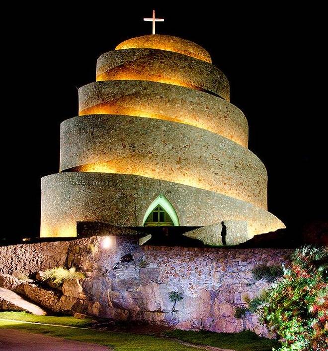 Se trata de una obra única en su concepción arquitectónica. El exterior se revistió piedra por piedra, tomadas del propio cerro. Para el interior del templo, dedicado a la Santísima Trinidad, se utilizaron ladrillos a la vista. Mide 20 metros de alto por 24 de diámetro.