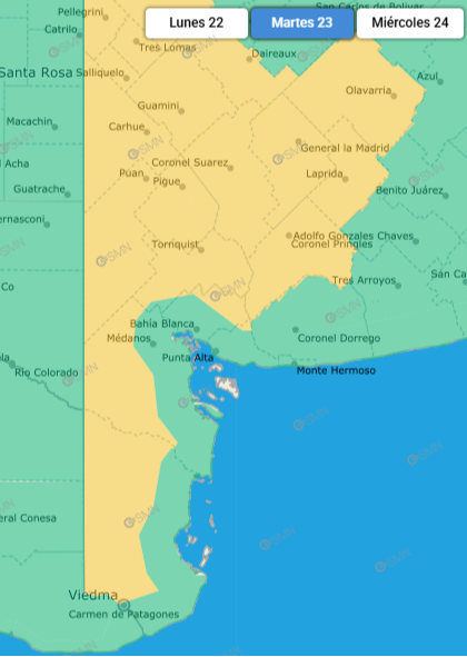 En este caso, las ciudades de Bahía Blanca, Punta Alta y Monte Hermoso quedan por fuera del área comprendido por la advertencia.