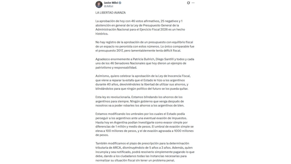 La aprobación en el Senado argentino de la Ley de Presupuesto 2026 y la Ley de Inocencia Fiscal representa una transformación en la política económica. Por eso, una vez finalizada la sesión se emitió un comunicado de la Oficina del Presidente y a su vez, Javier Milei publicó un mensaje celebrando ambas leyes.