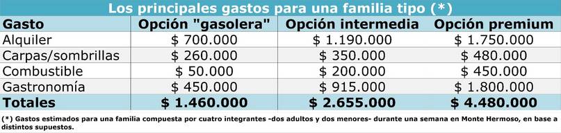 El valor más bajo (1.460.000 pesos) corresponde a una familia que se traslada a Monte Hermoso desde no más de 100 kilómetros a la redonda, alquila por 100 mil pesos diarios y hace un fuerte control de sus consumos en gastronomía y servicios de playa.