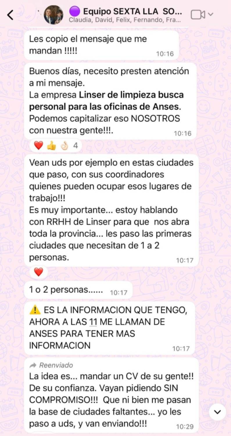 En los intercambios, Grippo Harrington enviaba mensajes a referentes libertarios de distintas localidades de la zona e incluso proponía otorgar puestos de trabajo a «gente de su confianza» en una empresa llamada Linser, prestadora del servicio de limpieza para la ANSES.