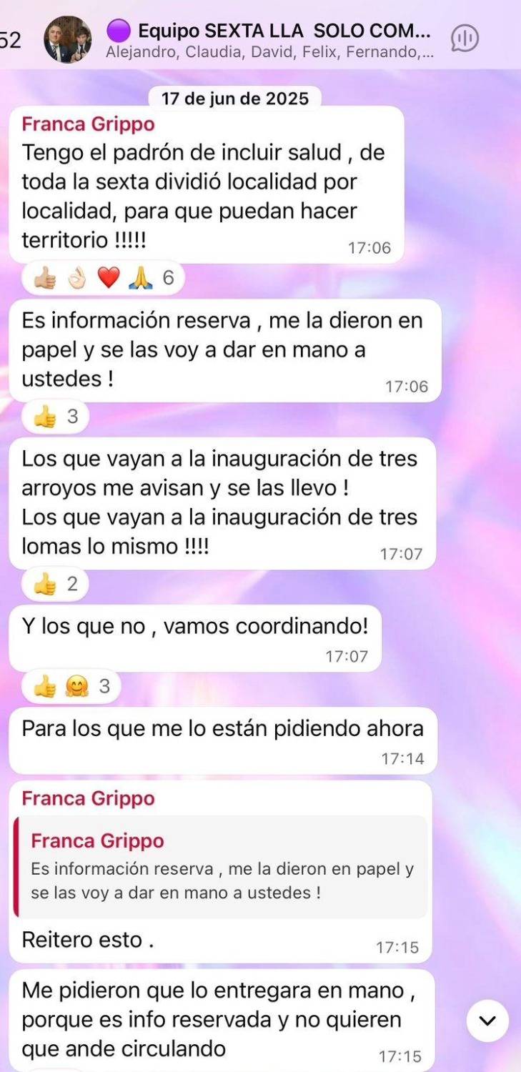 La novedad trascendió anteayer a través del sitio La Política Online y, posteriormente, se filtraron chats de un grupo de WhatsApp de ese espacio político, en los que se coordinaban acciones vinculadas a la última campaña electoral de septiembre pasado.