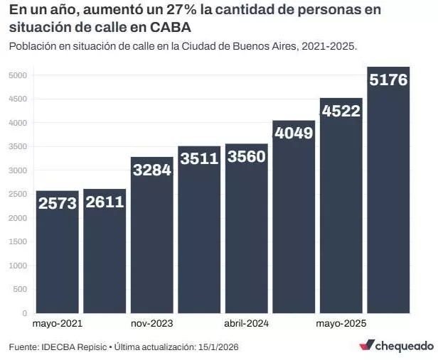 La cantidad de personas en situación de calle en la Ciudad de Buenos Aires volvió a crecer con fuerza en el último año. Según el relevamiento oficial del Ministerio de Desarrollo Humano y Hábitat porteño, en noviembre de 2025 se registraron 5.176 personas, frente a las 4.049 contabilizadas en noviembre de 2024, lo que representa un incremento del 27,8%.